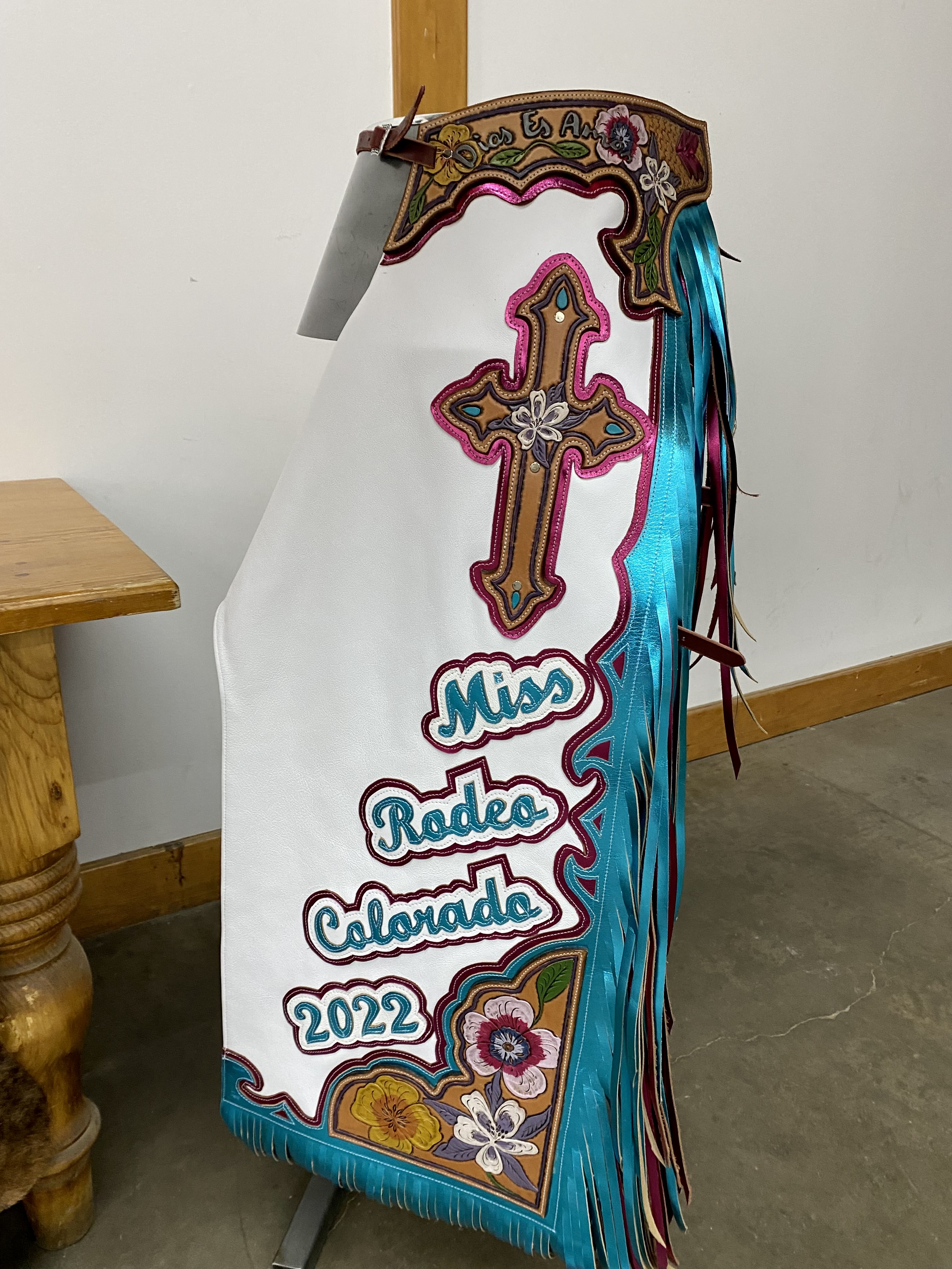 ¡Hola! Ashley Baller, Miss Rodeo Colorado 2022 here. I’ve always been enamored by the rodeo queen’s unique form of expression through her chaps. My floral, colorful pair tell a special story! At first glance of my Pro Rodeo Original chaps, my intention is for them to showcase my faith, my culture and bright positivity. My big brother is an artist, so I tasked him with designing them. All I let him know was that I wanted to include flowers (a Columbine and two native to Mexico). With that, he perfectly sketched a design that included Colorado’s state flower, the Giant Ombré Hibiscus, the Mexican Tulip Poppy and a cross to represent my faith. With elegant tooling, we included in Spanish “Dios es Amor” (God is Love) in the yoke. They were truly designed with love and the Spanish flare speaks to a key piece of my platform in building community with Spanish and English speakers. What’s so neat about them is that they’re tooled with my brother’s exact artwork! Dale and Hannah at Pro Rodeo Originals did spectacular work. Dale also built my very first pair of rodeo princess chaps when I was 12-years-old! This is another reason why my Miss Rodeo Colorado chaps are so special!
