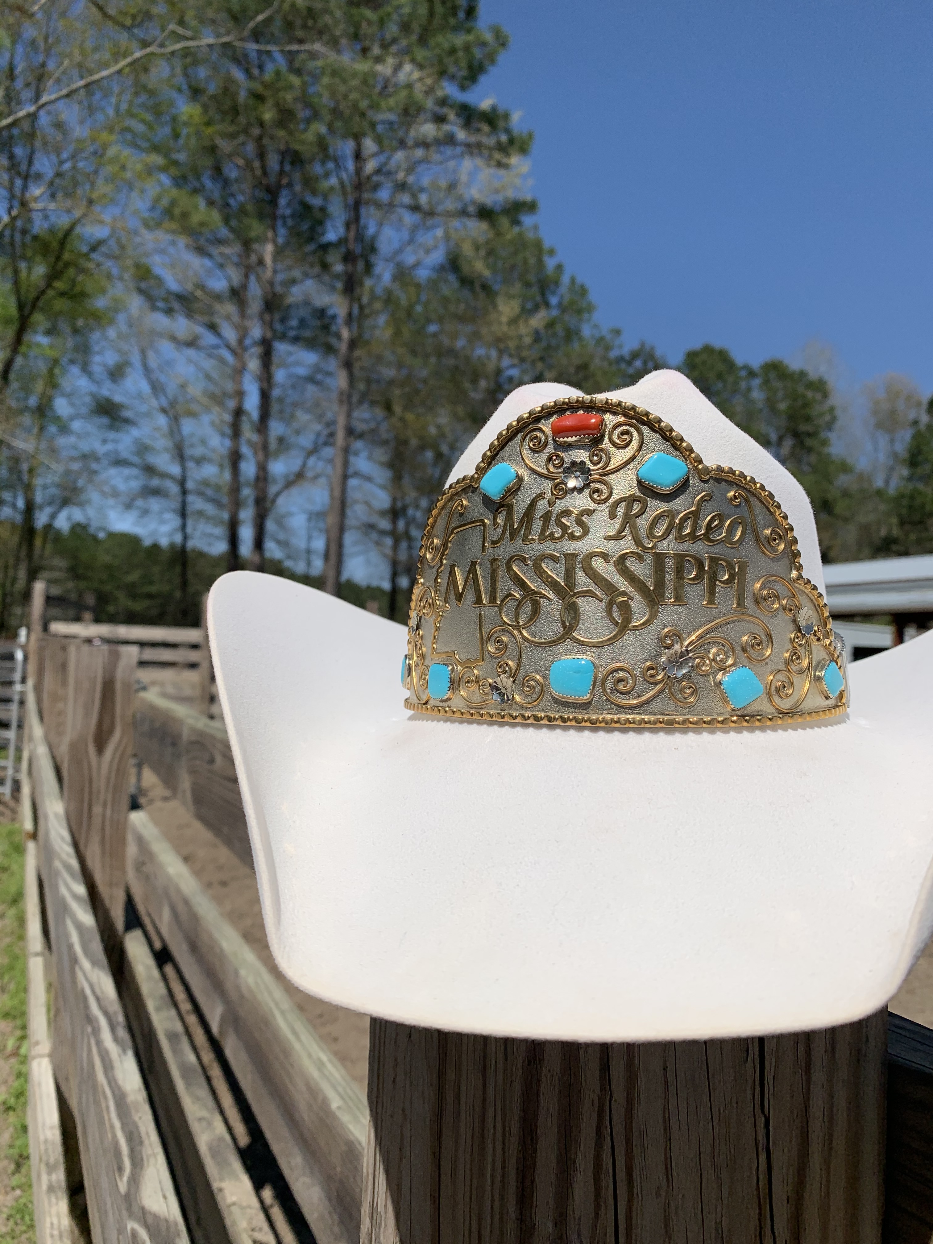 The Miss Rodeo Mississippi pageant began in 1974, with Tracey Thompson becoming the State’s first Miss Rodeo and wearing the original crown designated for the title. In 2005, the crown was redesigned to the one we use today and was crafted by Yellowhair Buckles. The red stone represents our history as prior to 2010. The stones were all originally turquoise, and when our state won Miss Rodeo America for the first time, we incorporated the red stone to commemorate this milestone. Generally, the crown is passed down each year, but any Miss Rodeo Mississippi that is crowned Miss Rodeo America is given her state crown that she wore all year as a gift from the board to honor her achievement. A new one is then passed down again to the next title holder.