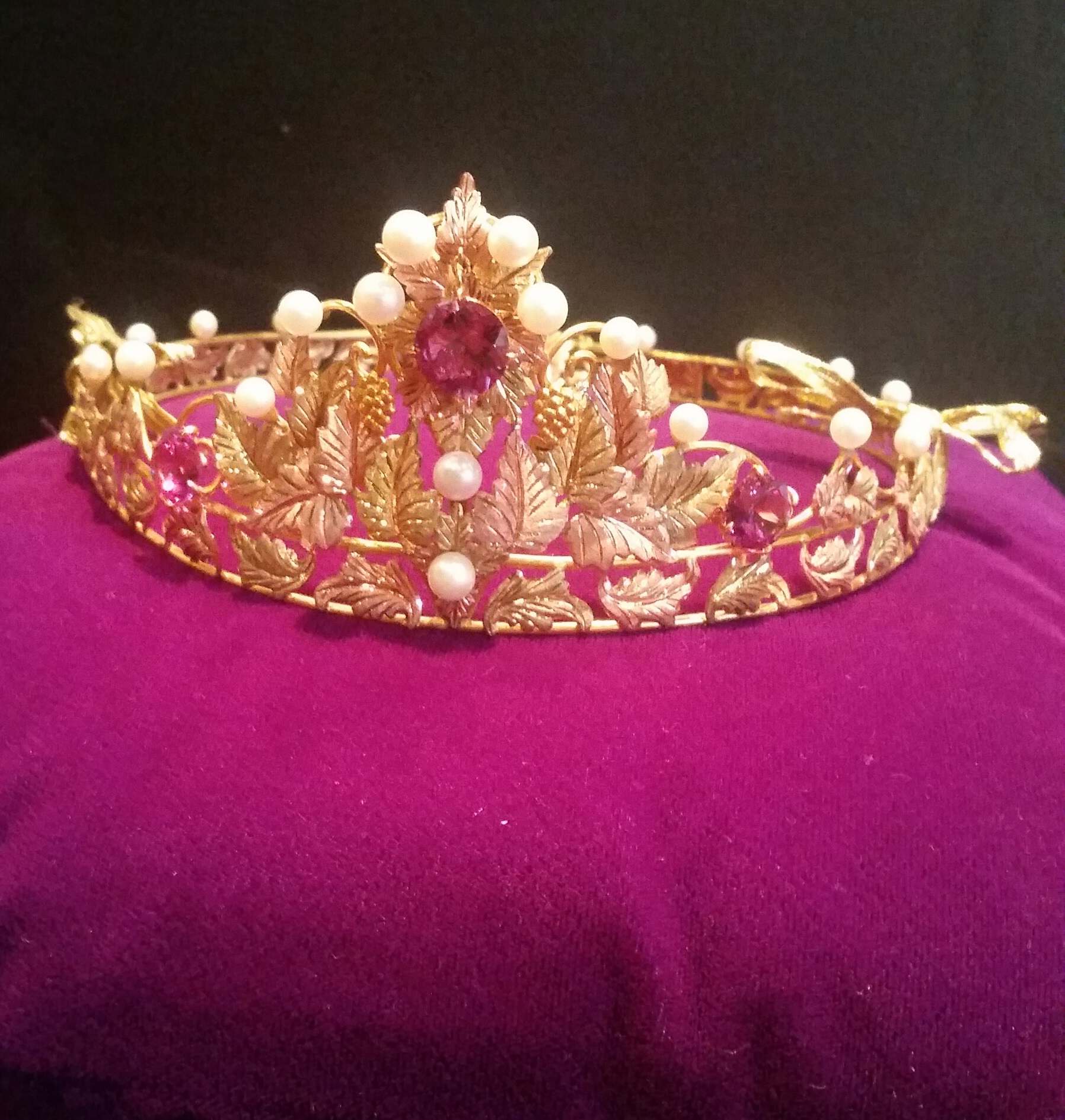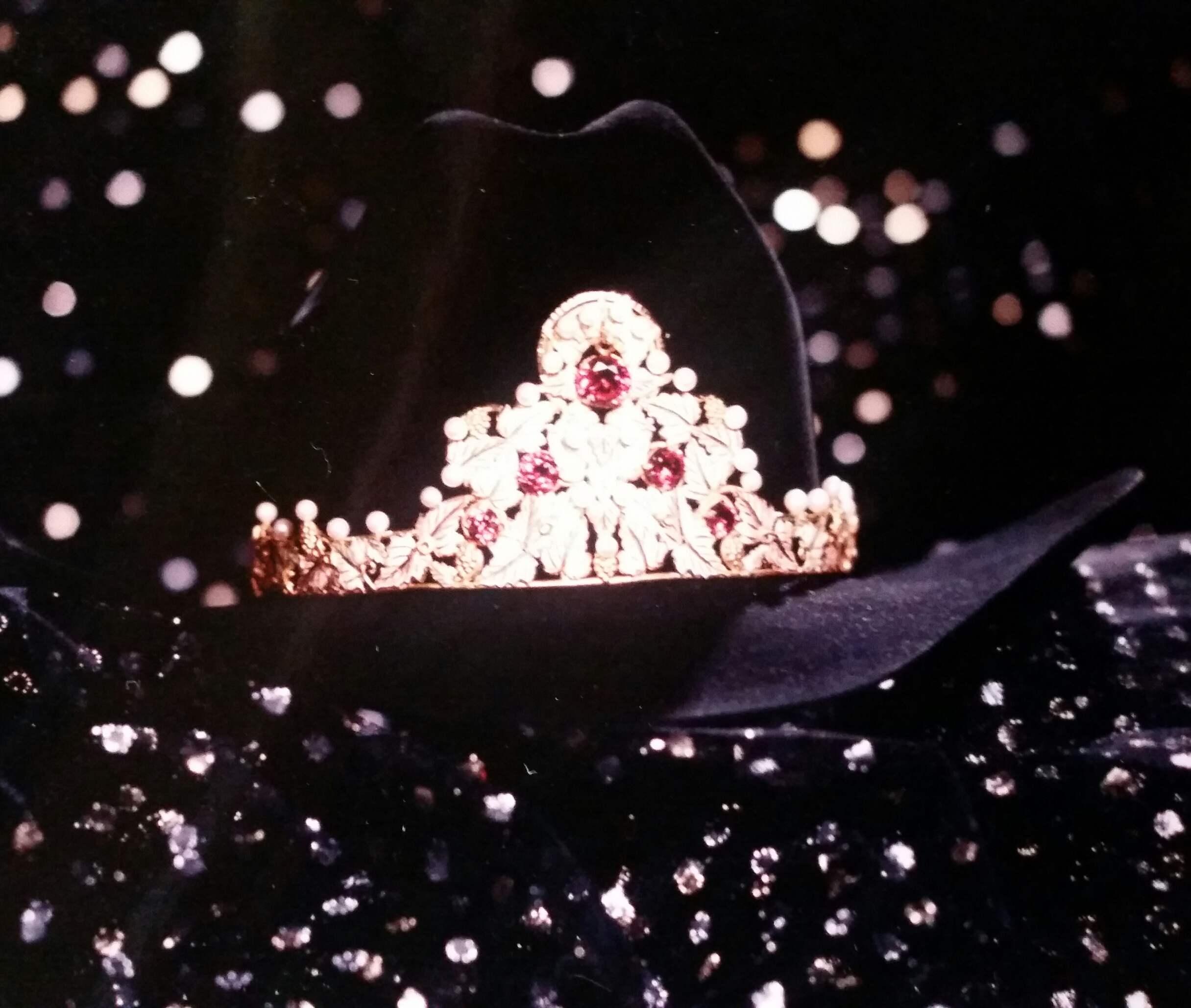 First, let’s get you started on the basics of the crown that has become a symbol of the Miss Rodeo America Organization. The crown is made and sponsored by Landstrom’s Original Black Hills Gold Creations of Rapid City, South Dakota. The first crown20150406_150524-1 was created in 1965 and currently resides in the Pro Rodeo Hall of Fame.  The beautiful Black Hills Gold design features grape leaf clusters and vines and consists of several cultured pearls and alexandrite stones.  A 1981 Federal Mandate states that Black Hills Gold Jewelry must be manufactured within the Black Hills region of South Dakota and Wyoming.